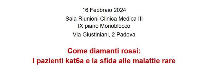 "Come diamanti rossi: I pazienti kat6a e la sfida alle malattie rare" 16 Febbraio 2024 Sala Riunioni Clinica Medica III IX piano Monoblocco Via Giustiniani, 2 Padova